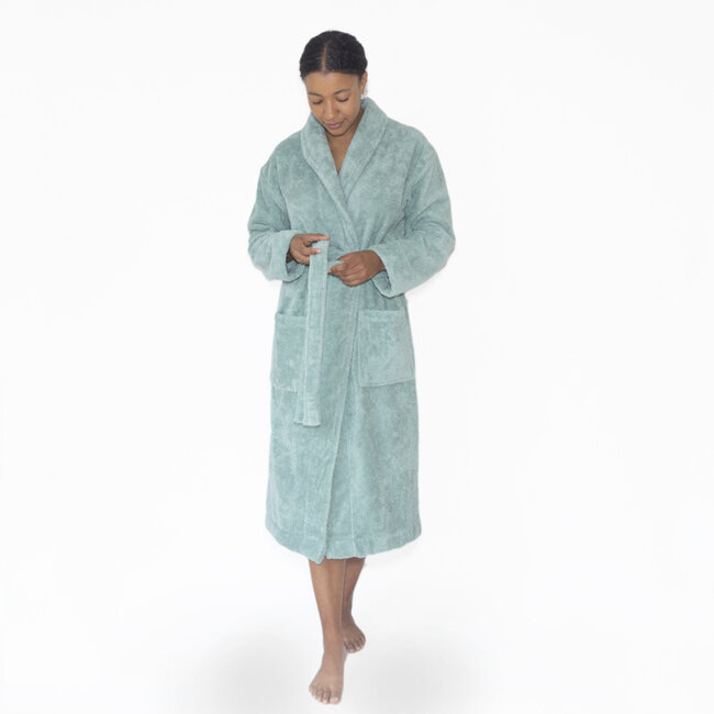 The bathrobe falls smoothly over the shoulders and around the body. The bathrobe is made of woven terry cloth (500 g/m²) and has loops on both the outside and the inside. This makes the bathrobe feel very soft, even after frequent washing.
