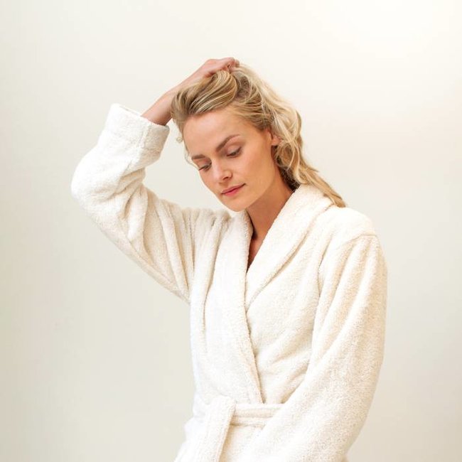 The bathrobe falls smoothly over the shoulders and around the body. The bathrobe is made of woven terry cloth (500 g/m²) and has loops on both the outside and the inside. This makes the bathrobe feel very soft, even after frequent washing.