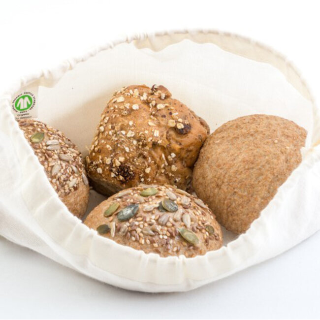 Deze zakken zijn maat M (20x30cm), geschikt voor broodjes en mandarijnen. De zakken kunnen door middel van een koord aan de bovenkant worden afgesloten. De kleur is natural. De zakken zijn wasbaar op een lage temperatuur; houd rekening met krimp.